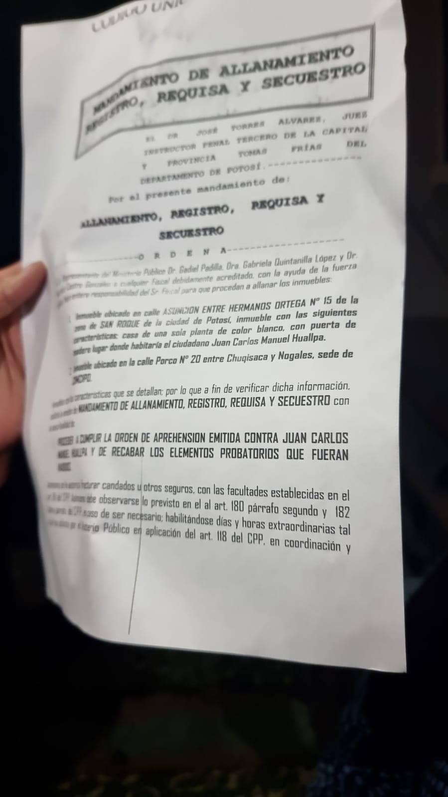 El juez Instructor Penal Tercero de la capital y provincia Tomás Frías del departamento de Potosí emitió el “mandamiento de allanamiento, registro, requisa y secuestro” para que el Ministerio Público de cumplimiento con el apoyo de la fuerza pública.