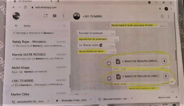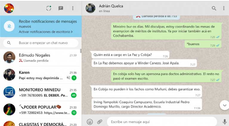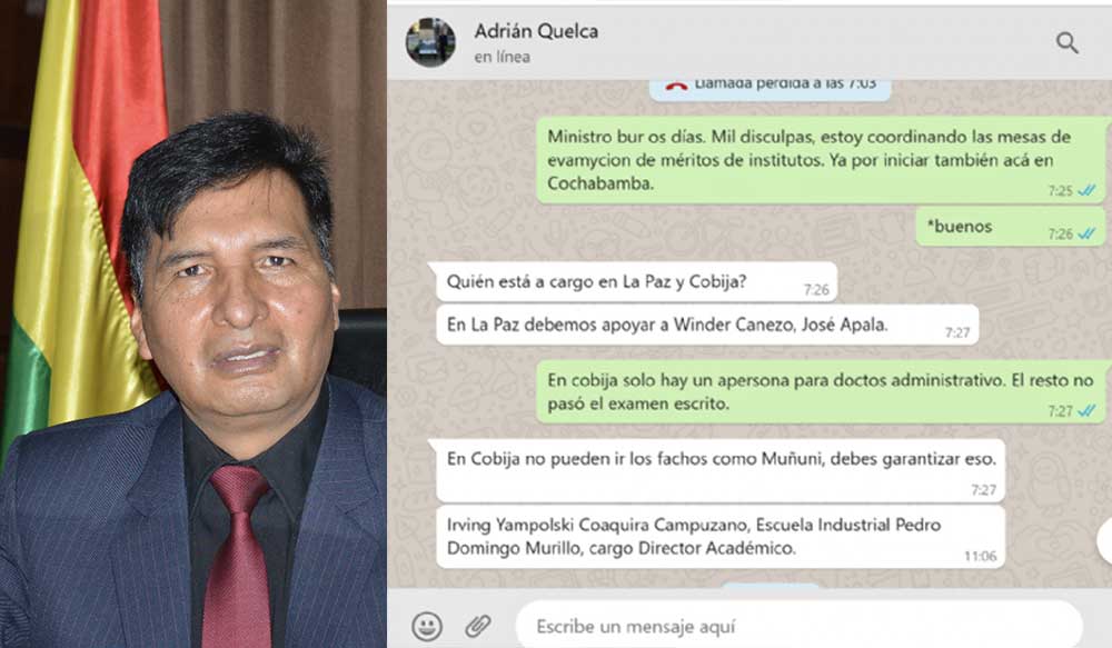 En el amplio historial de conversaciones virtuales que investiga la Fiscalía, figuran como protagonistas el ministro de Educación, Adrián Quelca, y al menos otros 46 docentes y postulantes a cargos directivos, que -se presume- aprobaron porque les dieron las respuestas de los exámenes de institucionalización, según mensajes de chat, audios, videos e informes a los que tuvo acceso Página Siete.
