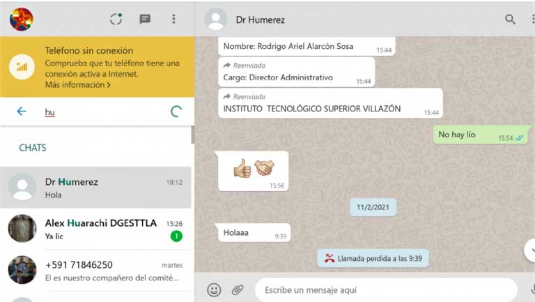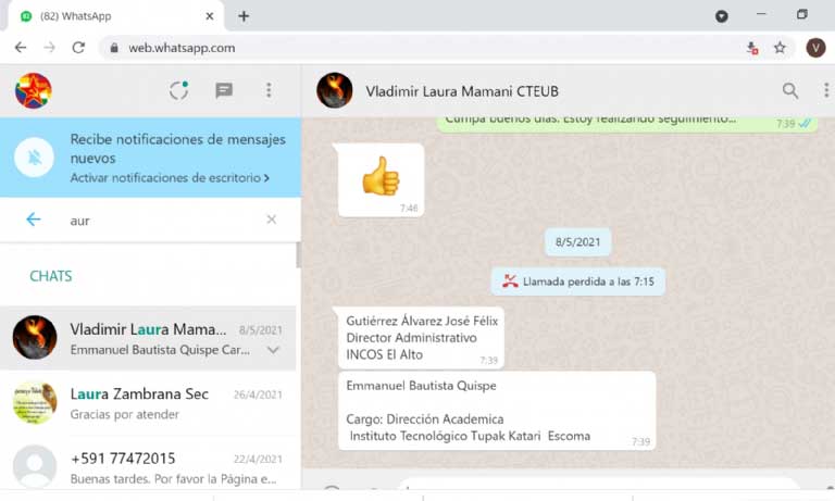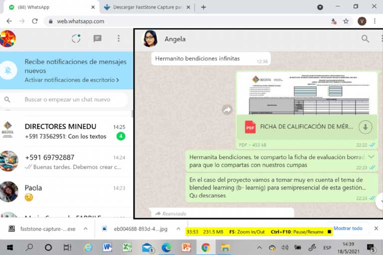 “Hermanito, bendiciones infinitas”, escribió Ángeles García a Tarifa, la primera semana de febrero. “Hermanita bendiciones, te comparto la ficha de evaluación borrador para que compartas con nuestros cumpas. En el caso del proyecto, vamos a tomar muy en cuenta el tema de blended learning (b-learnig), para semipresencial de esta gestión…(sic)”, respondió Tarifa y adjuntó el documento para facilitar la postulación.