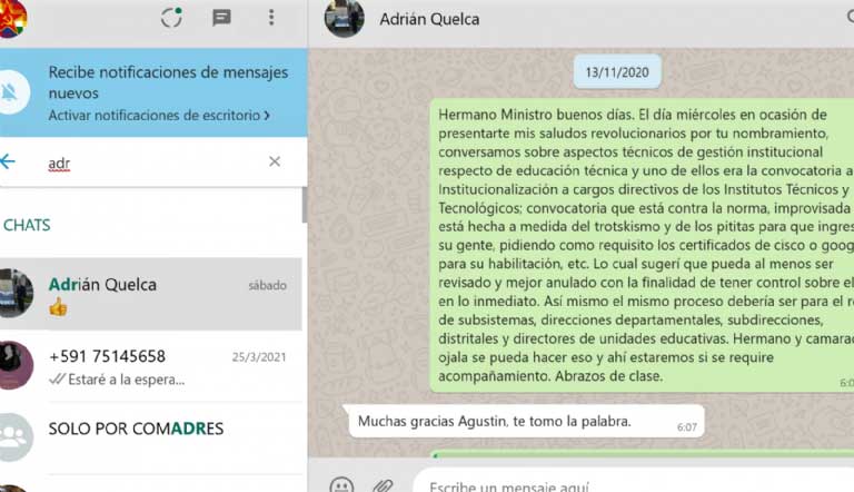 “Hermano ministro buenos días. El día miércoles, en ocasión de presentarle mis saludos revolucionarios por su nombramiento, conversamos sobre aspectos técnicos de gestión institucional (…) uno de ellos era la convocatoria a institucionalización a cargos directivos (…) que está contra la norma, improvisada, hecha a medida del trostkismo y de los pititas, para que ingrese su gente”, escribió Tarifa a Quelca el 13 de noviembre de 2020.