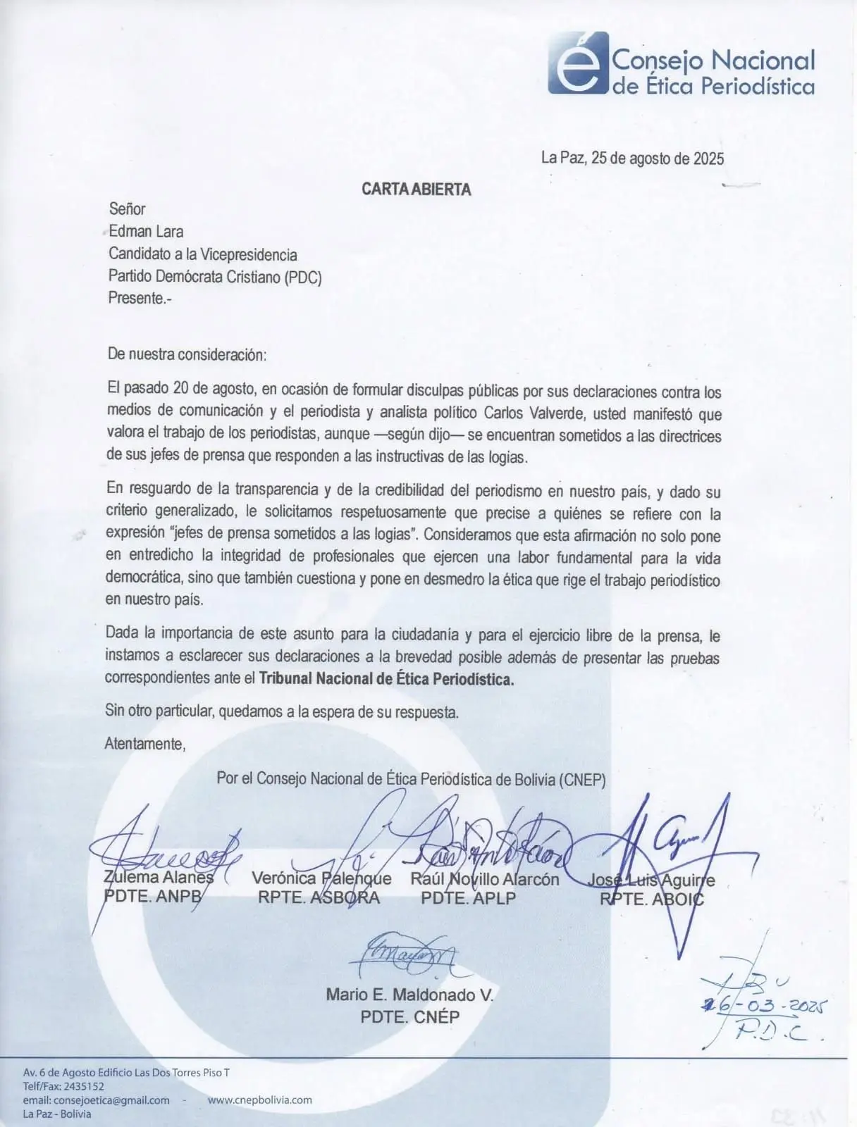 El Consejo Nacional de Ética Periodística rompió el silencio y salió al frente de las polémicas declaraciones del expolicía y actual candidato Edman Lara, quien denunció que varios “jefes de prensa” estarían sometidos a logias. La instancia ética le pidió, de manera categórica, presentar pruebas y nombres que respalden sus afirmaciones.
