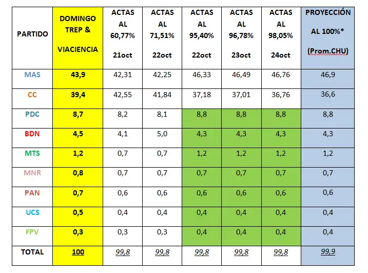 El TREP se paró con esa tendencia al 83% y el cómputo oficial hasta las 6am del lunes solo llegaba al 18,5%. En la noche, ese cómputo oficial de actas despegó al 60%, el martes al 95%, el miércoles al 96% y el jueves al 98%. En esos tres días siete candidaturas se estancaron y no avanzaron ni una décima en sus porcentajes. Solo el MAS que había partido el lunes con 42,31% subió a razón de 46,33%; 46,49% y 46,76%. CC en cambio, arrancó incluso mejor con 42,55%, pero en las siguientes 72 horas bajo a 37,18%; 37,01% y 36,76%.