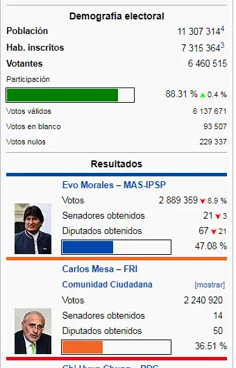 En números (para que vean que los porcentajes son engañosos) Morales obtuvo 2.889.359 votos y Mesa 2.240.920 votos. La diferencia fue de 648.439 de un total de votos válidos de 6.137.671 personas. Ojo, son los votos válidos los que cuentan y no los inscritos o el total del Padrón Electoral, que son cosas totalmente distintas.