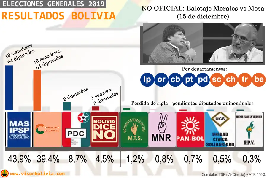 El primer resultado publicado, con el TREP y las encuestadoras (ojo, el canal del MAS, ATB, también lanzó esa proyección al 100%), daba 43,9% para Morales y 39,4% para Mesa. Debía llamarse a balotaje para el 15 de diciembre de 2019.