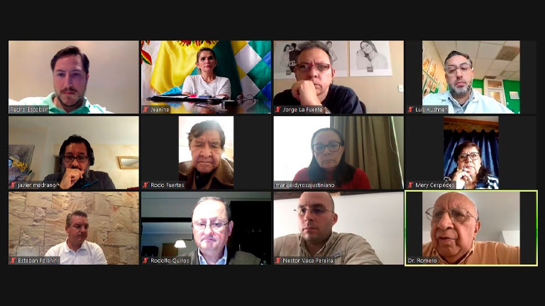 La presidenta Jeanine Áñez sostuvo este martes una videoconferencia con representantes de la Asociación de Clínicas Privadas de Bolivia, con el fin de coordinar acciones conjuntas para encarar la lucha contra la pandemia del COVID-19, que colapsó los servicios de salud público y de la seguridad social.