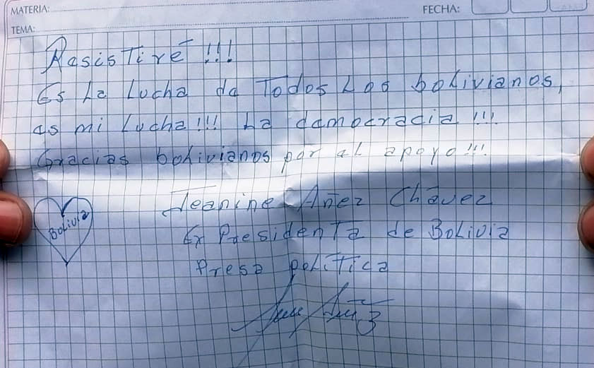 La nota manuscrita y firmada por Añez, como “presa política” dice: