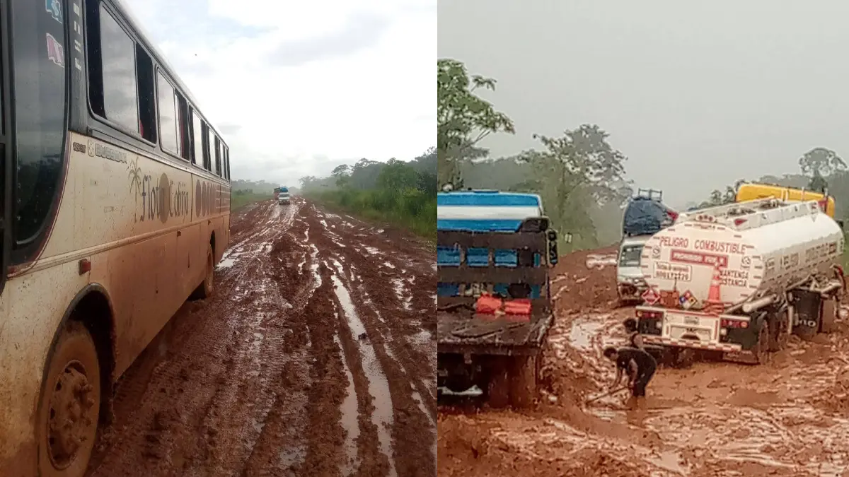 La situación fue reportada por pasajeros de la Flota Cobija, quienes difundieron imágenes que evidencian el crítico estado del camino. El tramo presenta condiciones severas de intransitabilidad, lo que ha paralizado por completo la circulación vehicular en la zona.