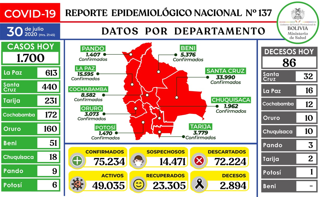 La pandemia sigue su curso ascendente en Bolivia luego de que se confirmara nuevos 1.700 casos y el deceso de 86 personas, según el último informe proporcionado por el Ministerio de Salud.