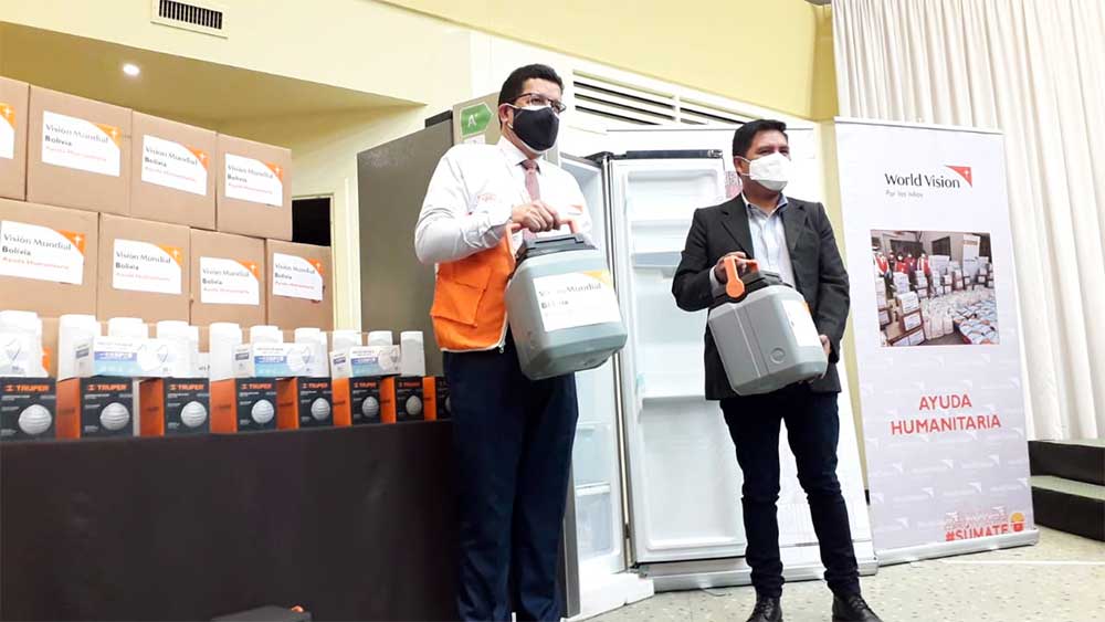 En el acto, el ministro de Salud, Jeyson Auza, agradeció a Visión Mundial por la entrega de 84 equipos de refrigeración, 244 transportadores de vacunas, 15.000 barbijos y 10.000 litros de alcohol en gel.